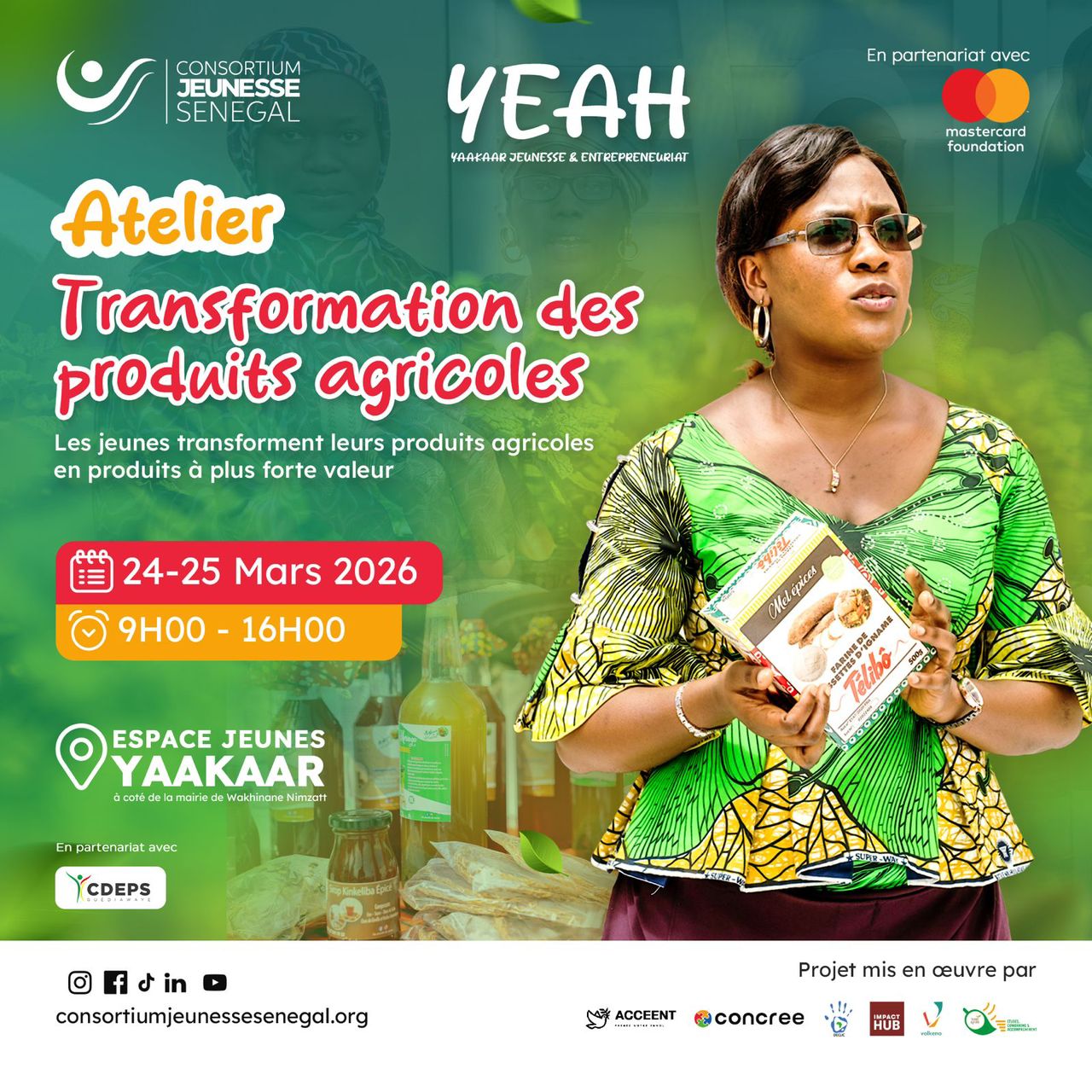 Rejoins l’Atelier de Transformation des Produits Agricoles le 24 et 25 Mars 2026 à partir de 9 h à l’Espace Jeunes Yaakaar, CDEPS Wakhinane et apprends à transformer tes récoltes en poudres, purées et jus à forte valeur ajoutée.